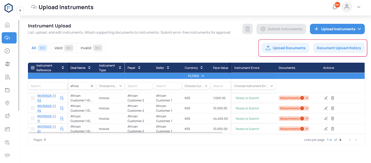 The bulk upload feature allows you to efficiently upload multiple supporting documents to various instruments at once. This guide explains the step-by-step process, available options, and troubleshooting tips.